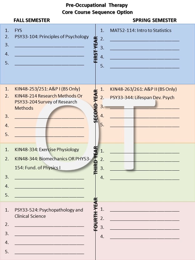 Download our Pre-OT Course Sequence Guide (PDF) for a suggested four-year core course sequence option.