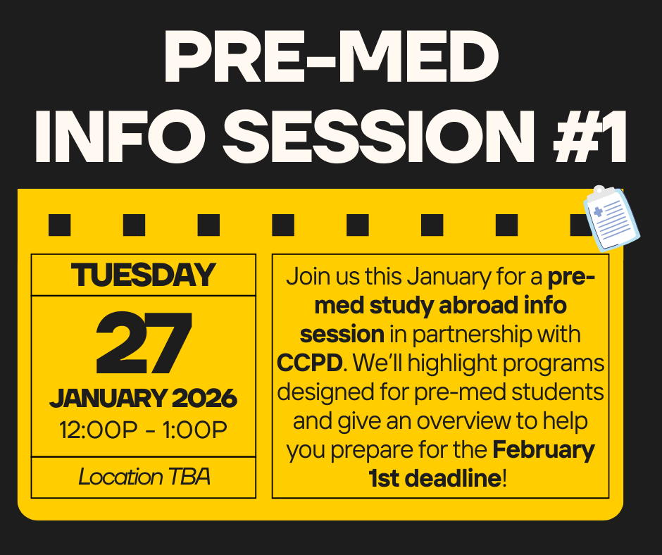 We’re hosting two Pre-Med Study Abroad Info Sessions this January on Tuesday the 27th and Wednesday the 28th, so mark your calendars! The locations are still to be determined. Check out some of the program highlights below!