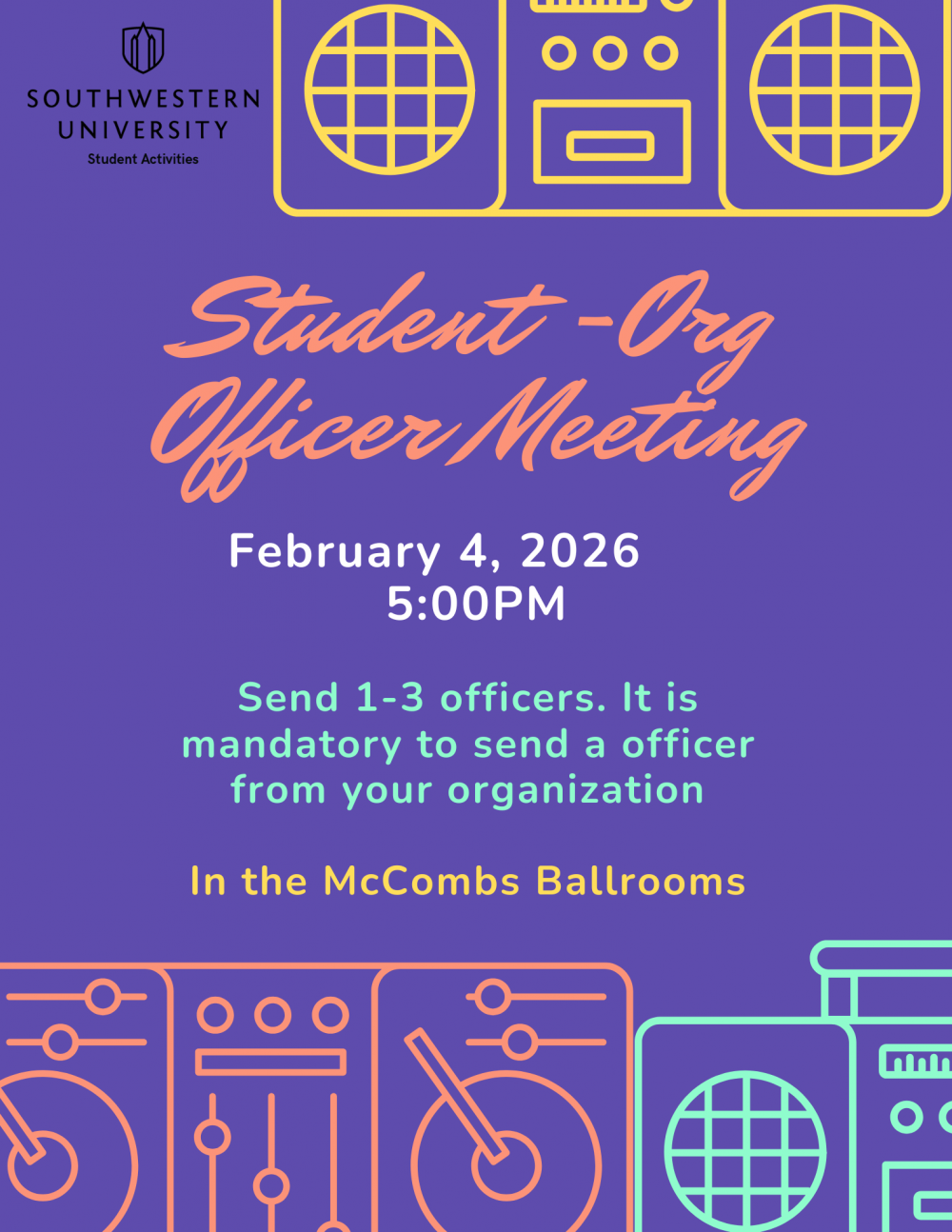 Calling all REGISTERED student organization presidents, vice presidents, treasurers, secretaries, and key officers! This mandatory meeting is your essential kickoff to a successful semester at Southwestern University. Whether you’re a seasoned leader or stepping into your role for the first time, this session will equip you with the tools, expectations, and resources you need to guide your organization with confidence.