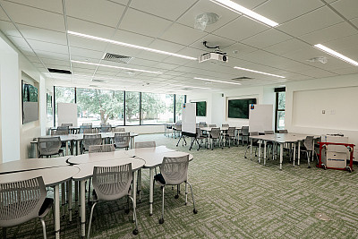 The latest technology is packed throughout the new Mood-Bridwell Hall. Advanced projection systems were included in each classroom. Enhanced wifi and networking capabilities were also installed throughout the building. The first-floor atrium features an interactive videowall, and each floor now has a state-of-the-art, environmentally-friendly Epson printing system. These new printers use 50% less power and utilize a water-based ink system, eliminating the need for petroleum-based toner.