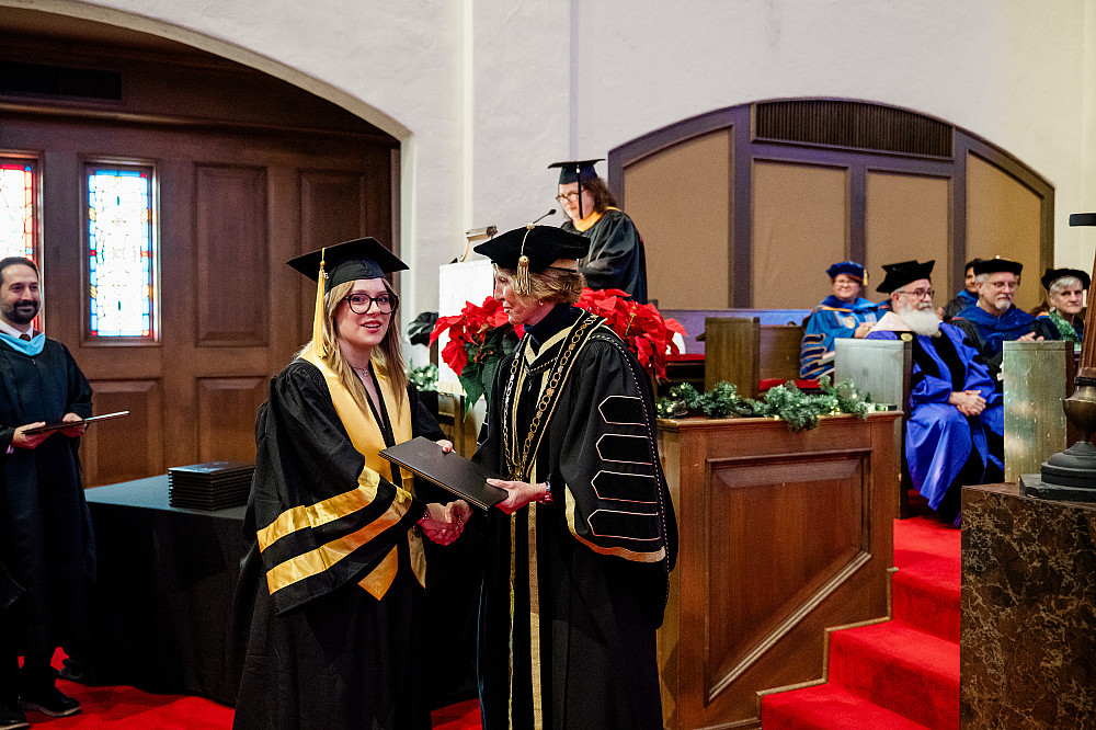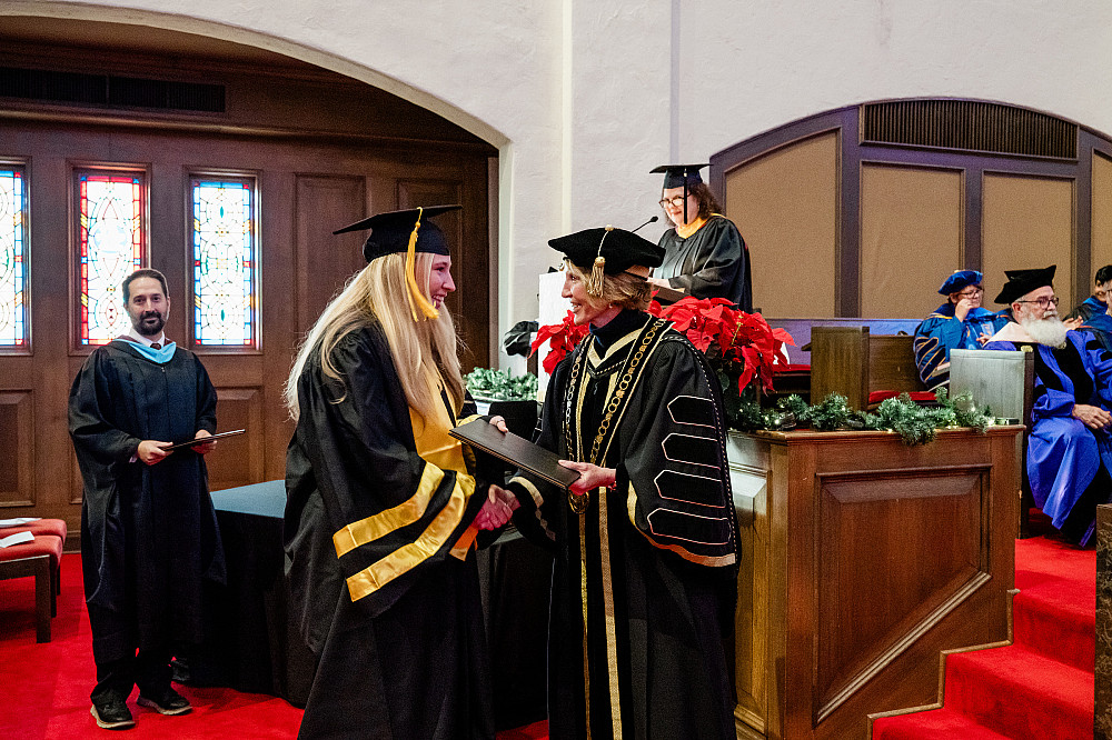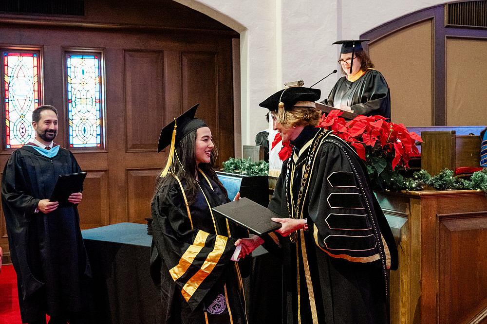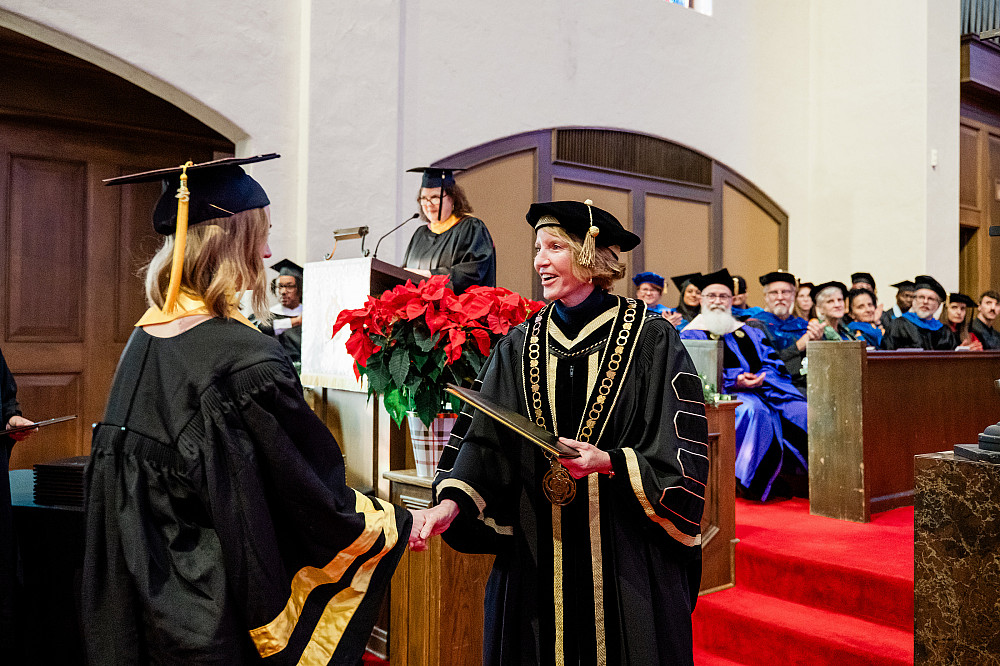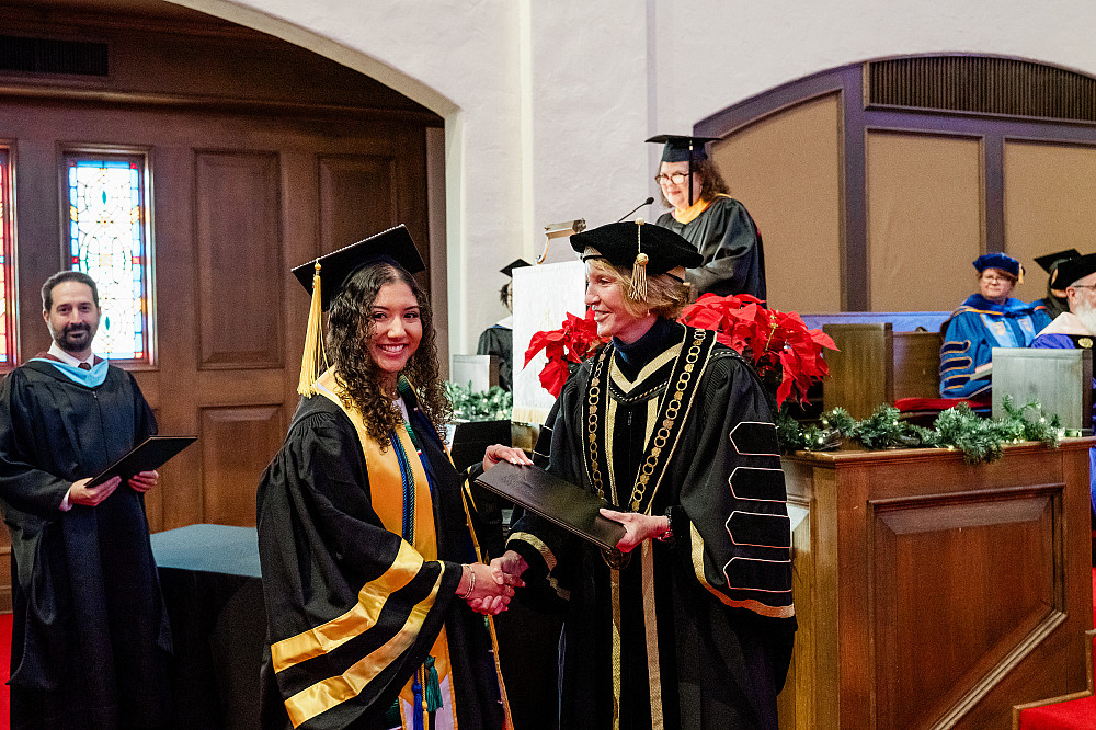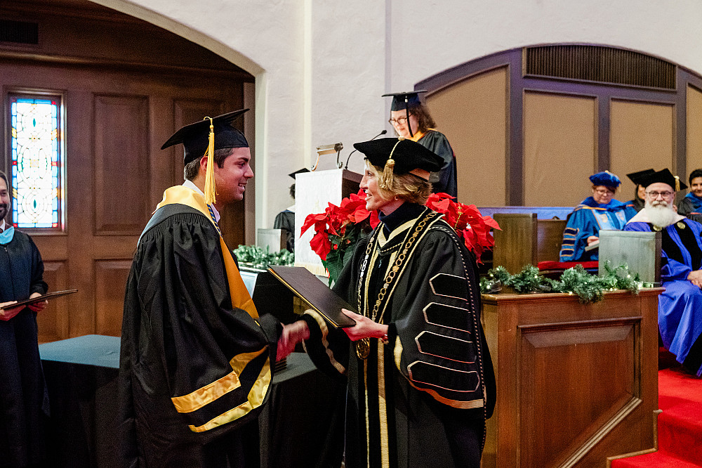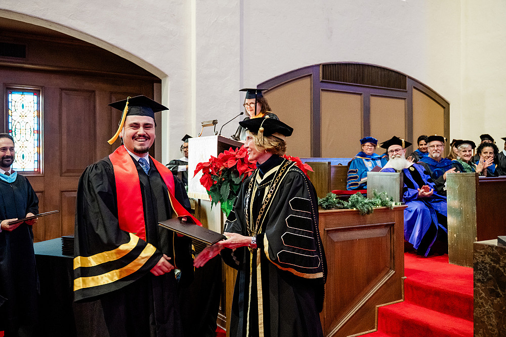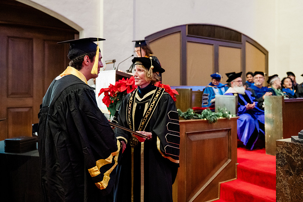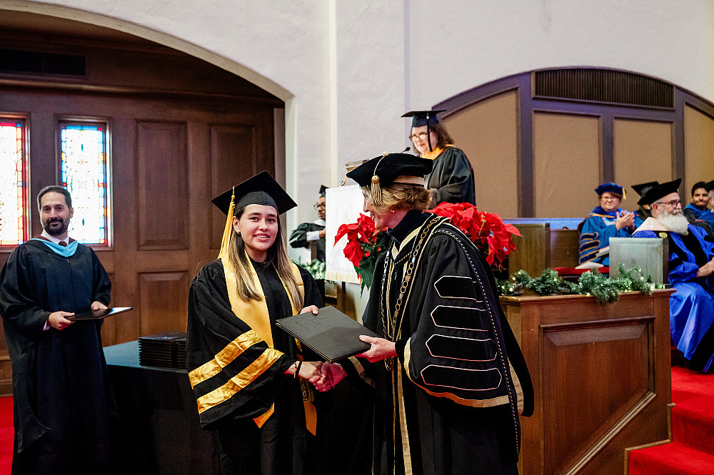 In front of a standing room-only crowd at the Lois Perkins Chapel, Southwestern University’s December graduates celebrated the completion of their undergraduate journeys with family, friends, faculty, and staff. Attendees heard remarks from Chaplain Ron Swain, President Laura Skandera Trombley, and alumni speaker Ben Woods ’06, prior to walking the stage and receiving their anticipated degrees.