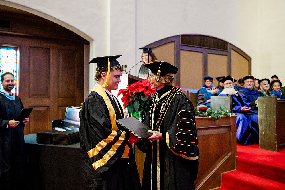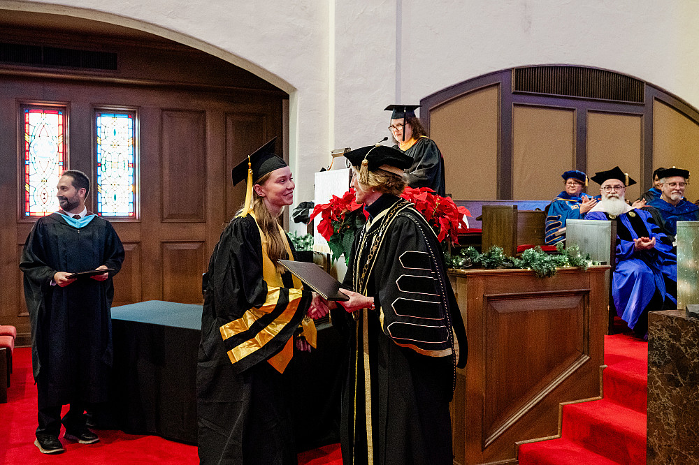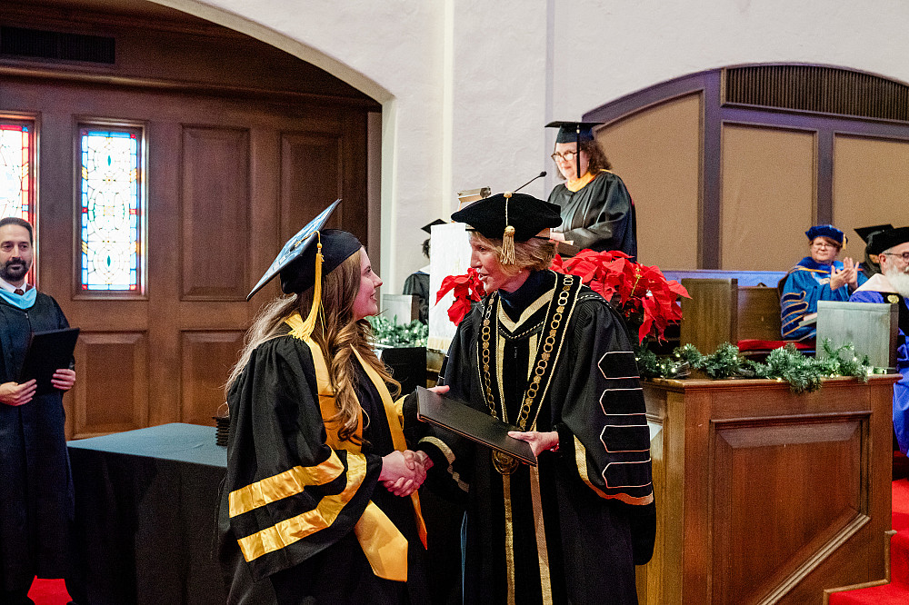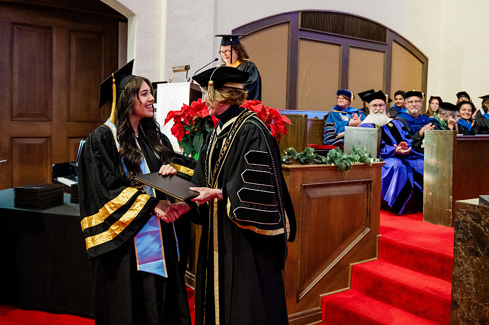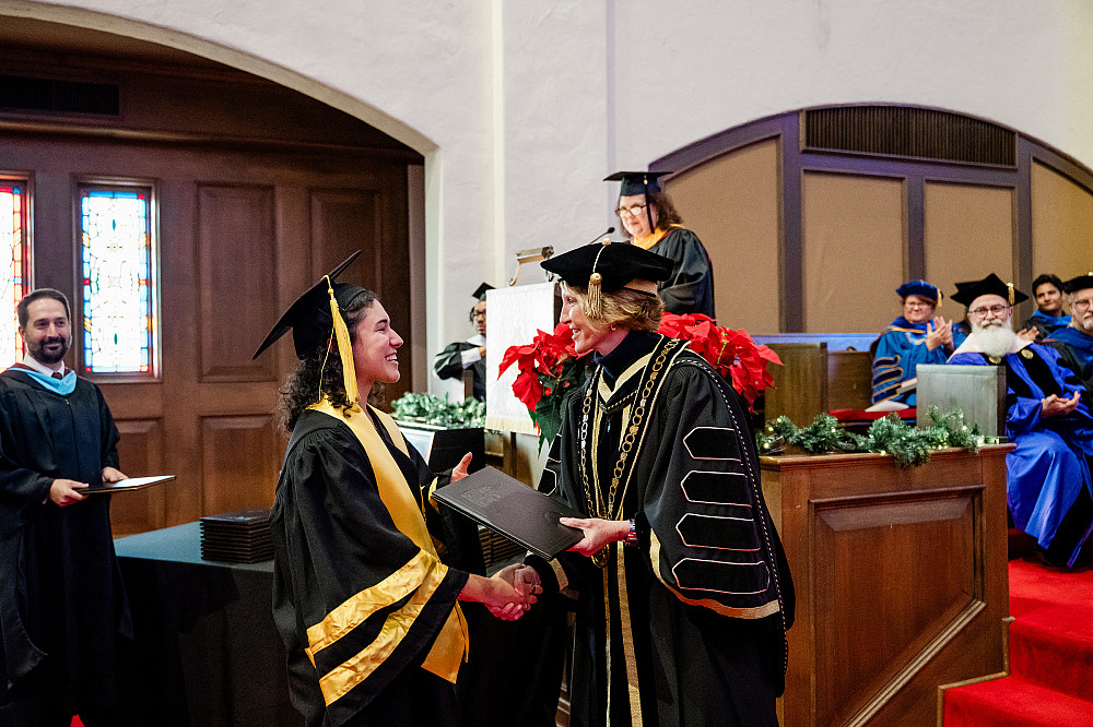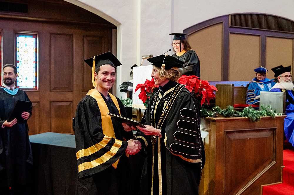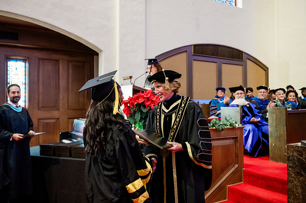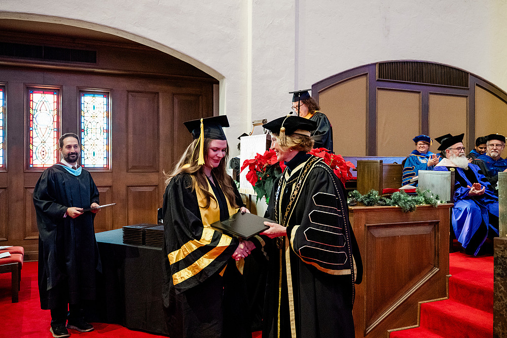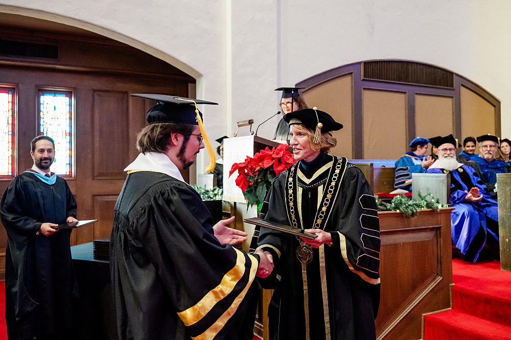 In front of a standing room-only crowd at the Lois Perkins Chapel, Southwestern University’s December graduates celebrated the completion of their undergraduate journeys with family, friends, faculty, and staff. Attendees heard remarks from Chaplain Ron Swain, President Laura Skandera Trombley, and alumni speaker Ben Woods ’06, prior to walking the stage and receiving their anticipated degrees.
