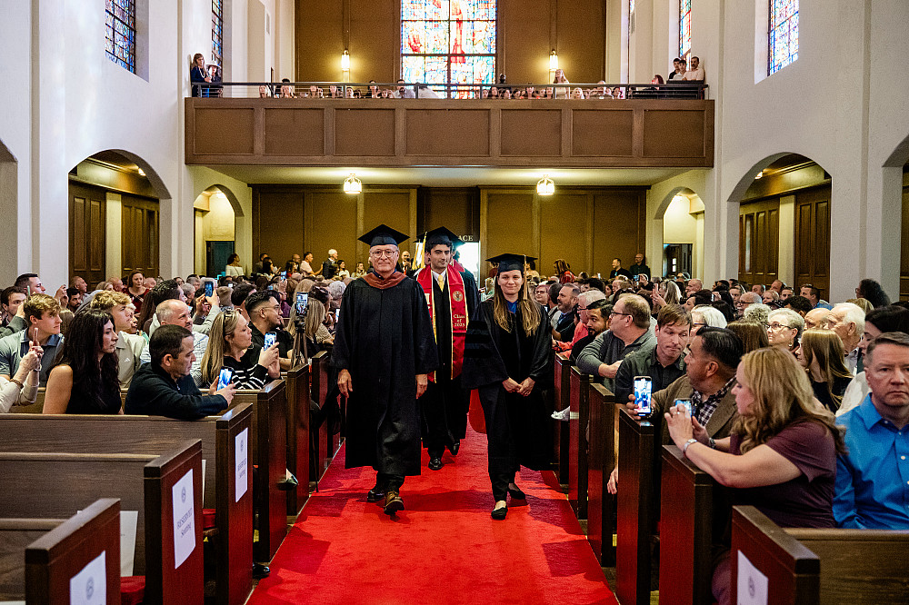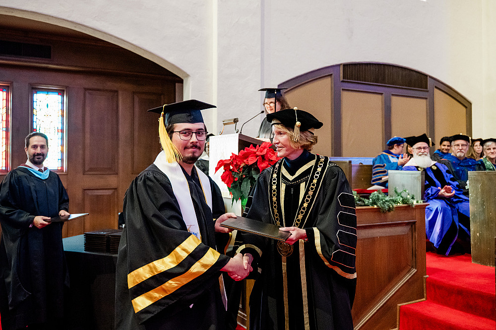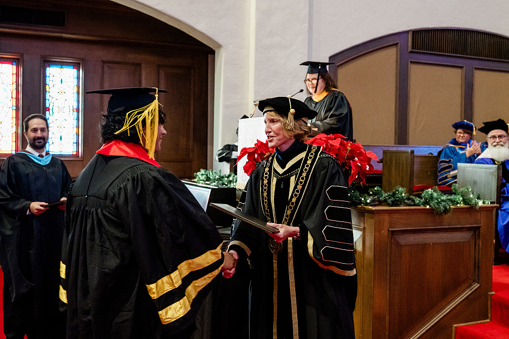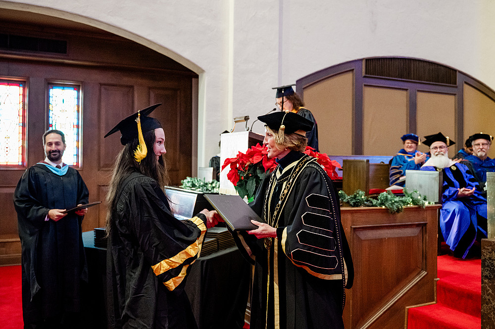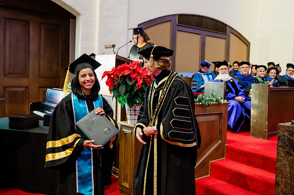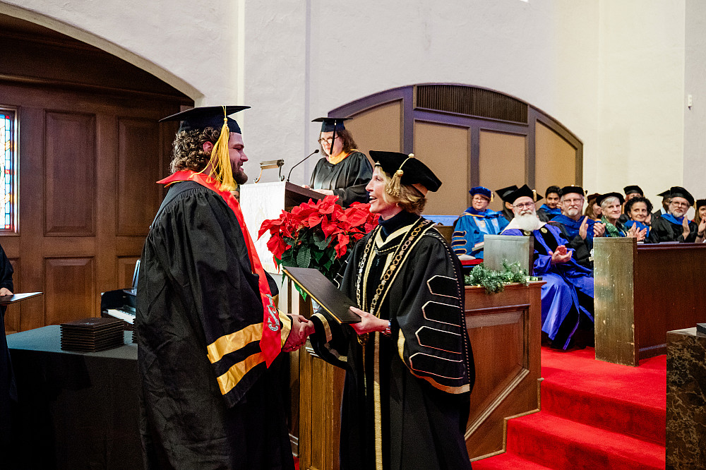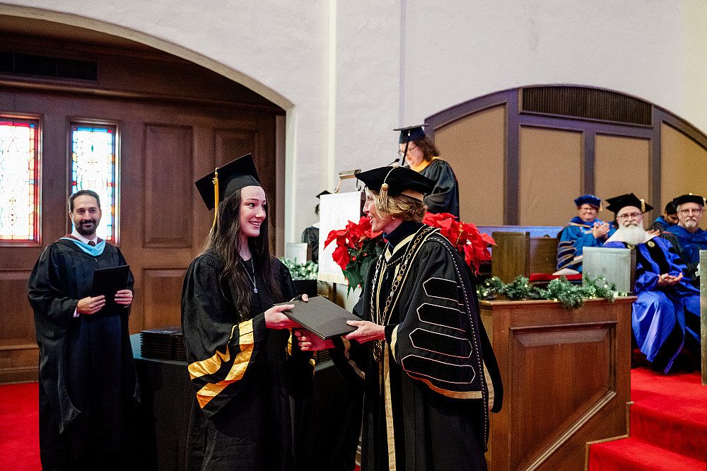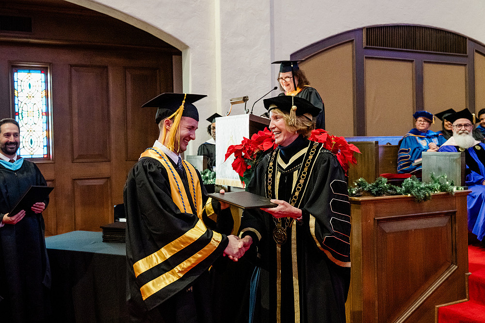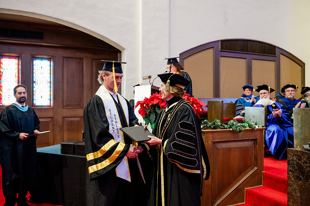 In front of a standing room-only crowd at the Lois Perkins Chapel, Southwestern University’s December graduates celebrated the completion of their undergraduate journeys with family, friends, faculty, and staff. Attendees heard remarks from Chaplain Ron Swain, President Laura Skandera Trombley, and alumni speaker Ben Woods ’06, prior to walking the stage and receiving their anticipated degrees.