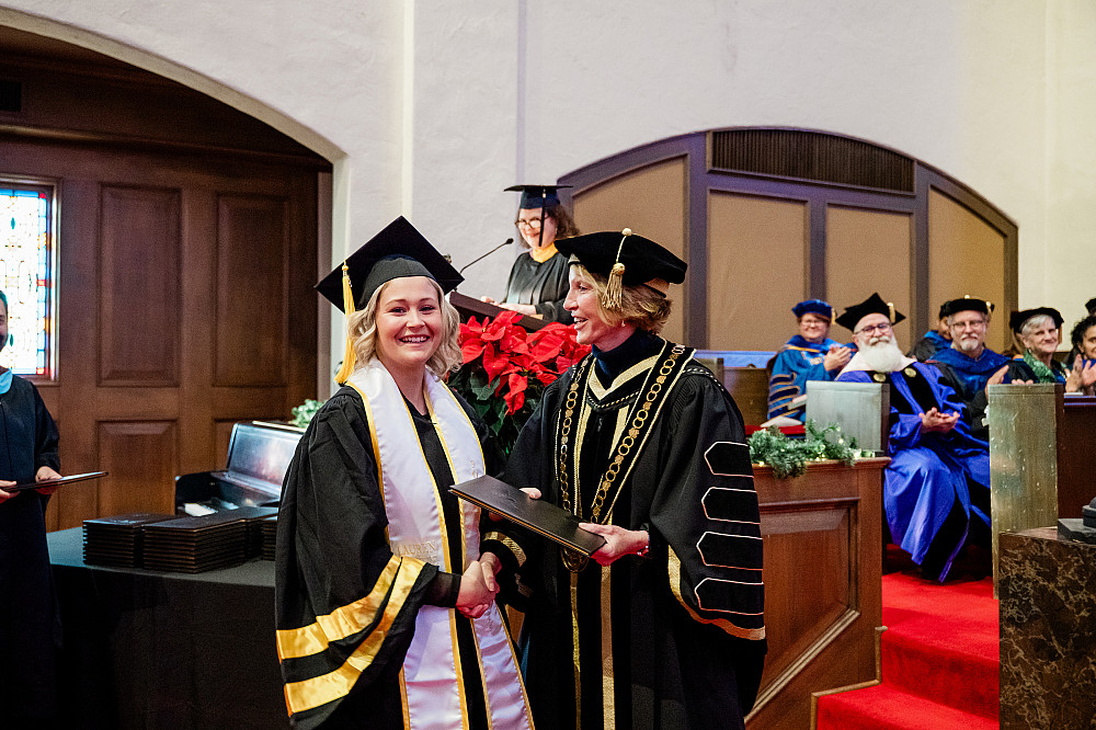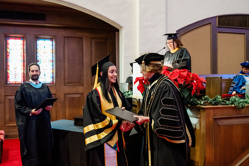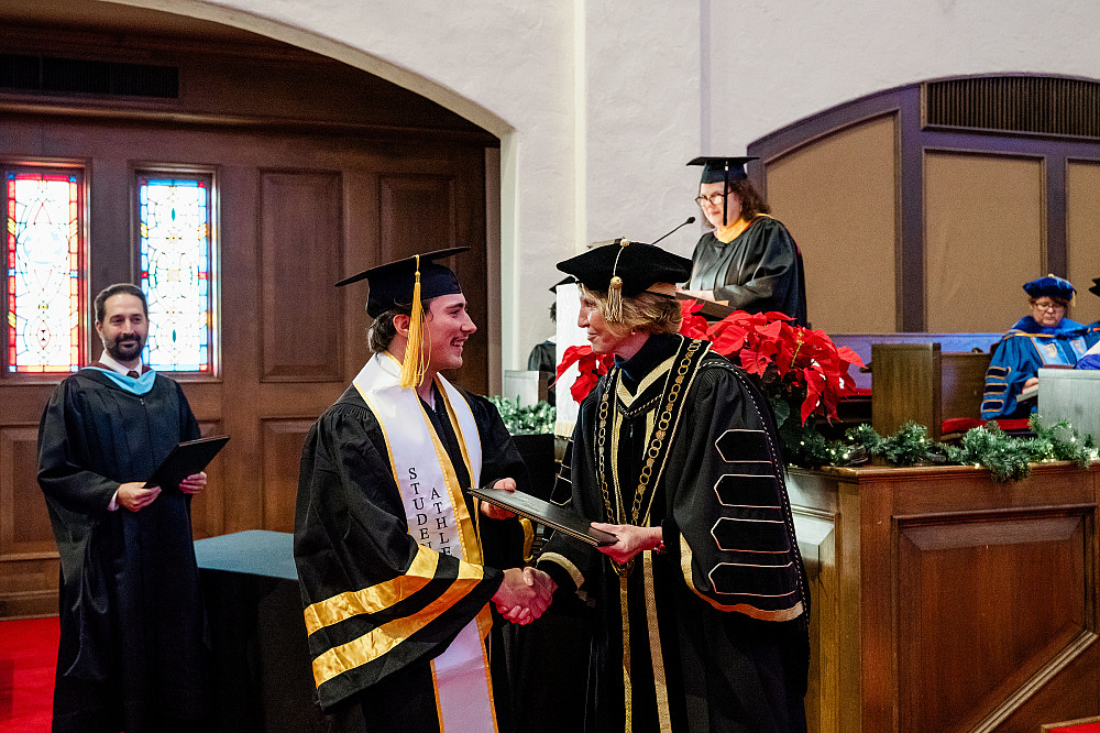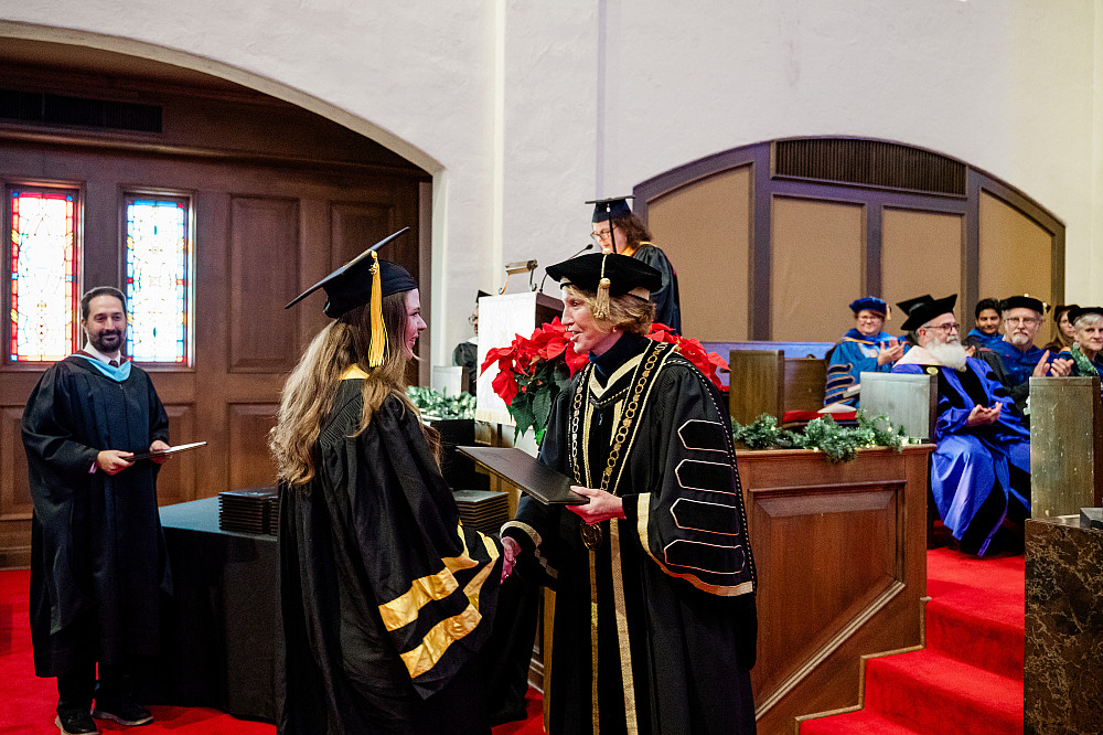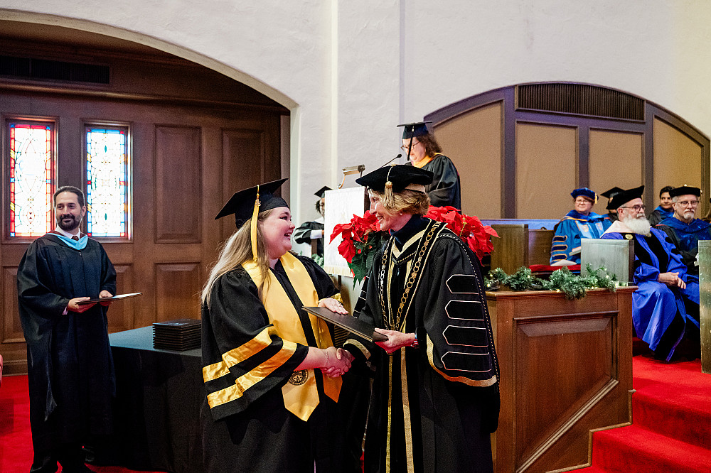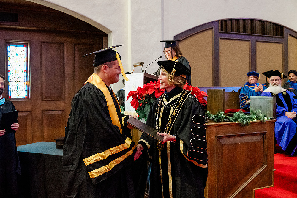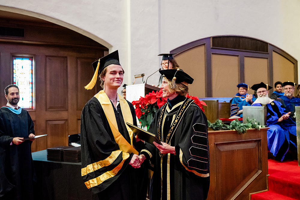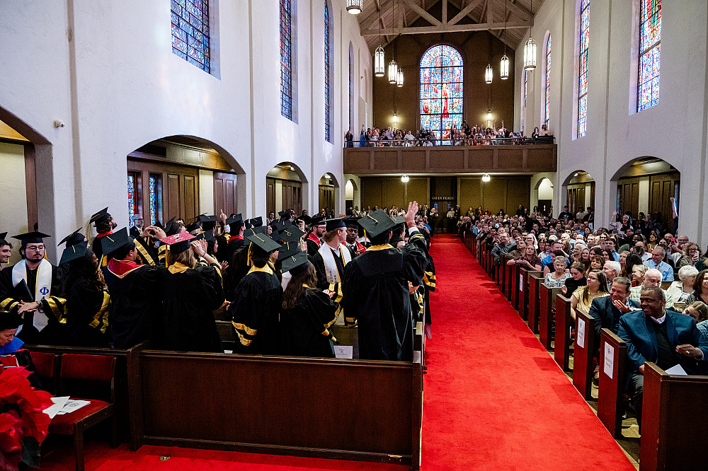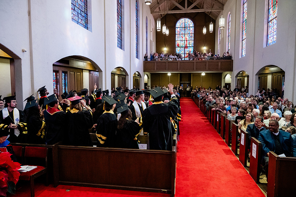 In front of a standing room-only crowd at the Lois Perkins Chapel, Southwestern University’s December graduates celebrated the completion of their undergraduate journeys with family, friends, faculty, and staff. Attendees heard remarks from Chaplain Ron Swain, President Laura Skandera Trombley, and alumni speaker Ben Woods ’06, prior to walking the stage and receiving their anticipated degrees.