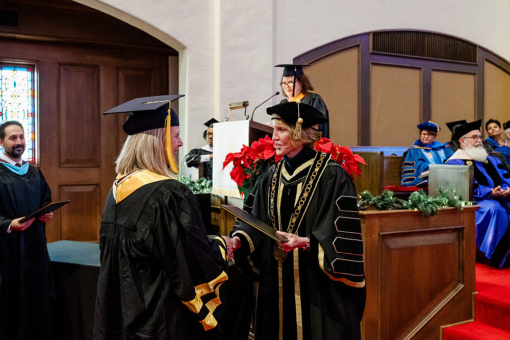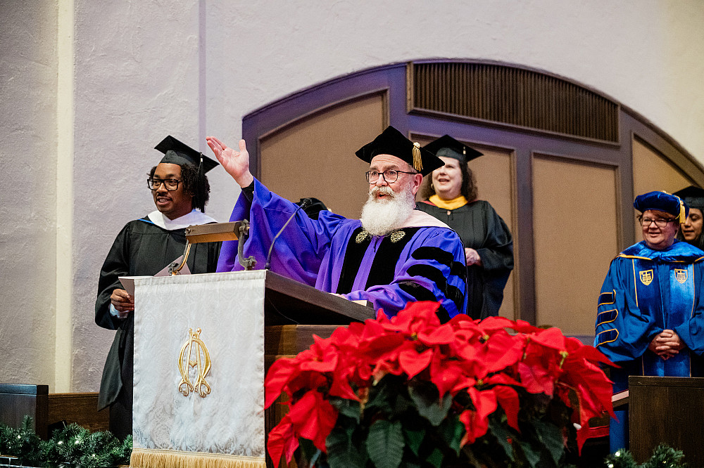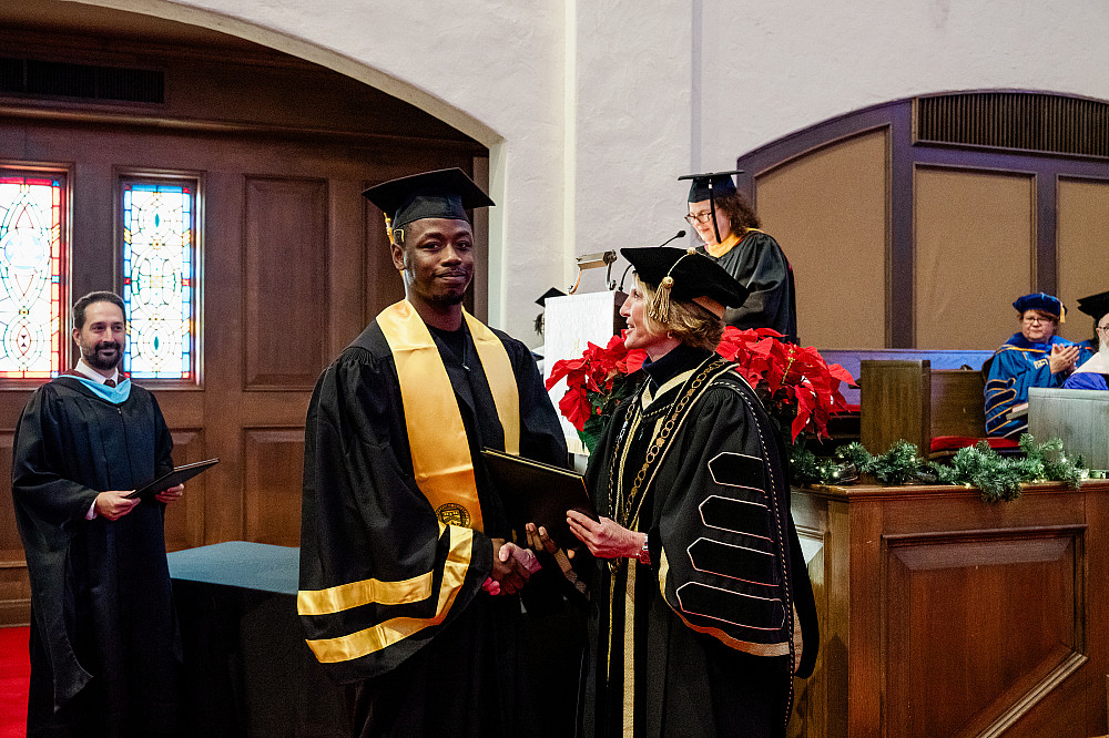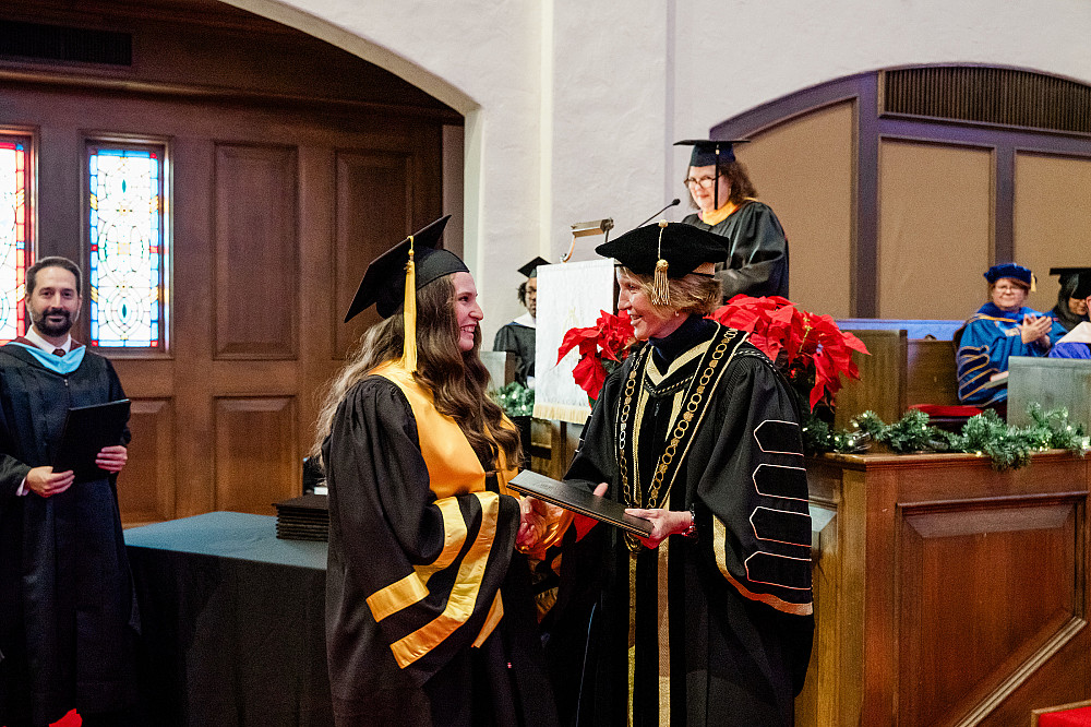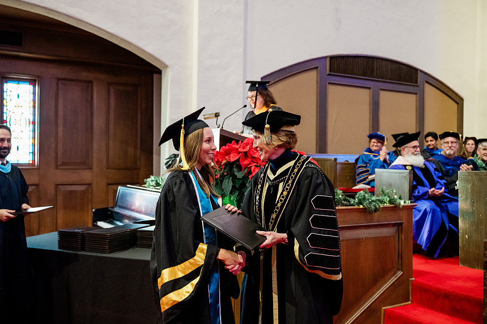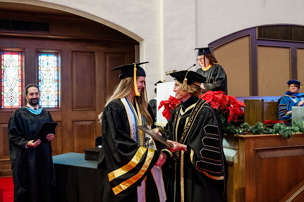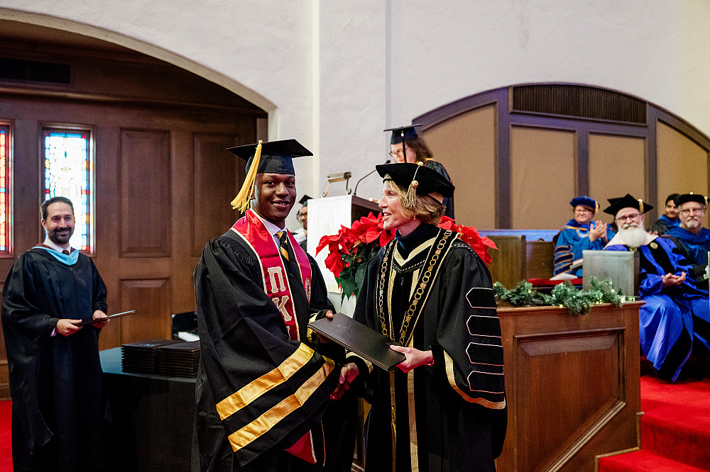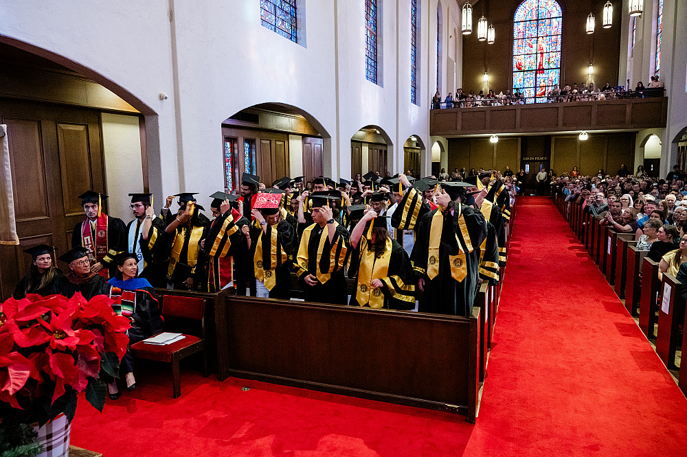 In front of a standing room-only crowd at the Lois Perkins Chapel, Southwestern University’s December graduates celebrated the completion of their undergraduate journeys with family, friends, faculty, and staff. Attendees heard remarks from Chaplain Ron Swain, President Laura Skandera Trombley, and alumni speaker Ben Woods ’06, prior to walking the stage and receiving their anticipated degrees.