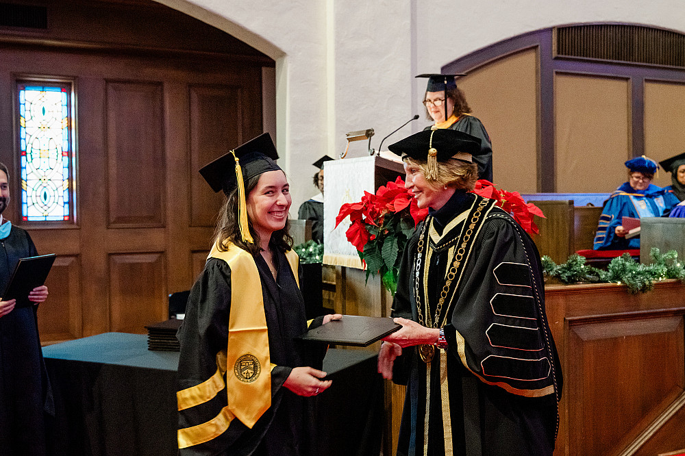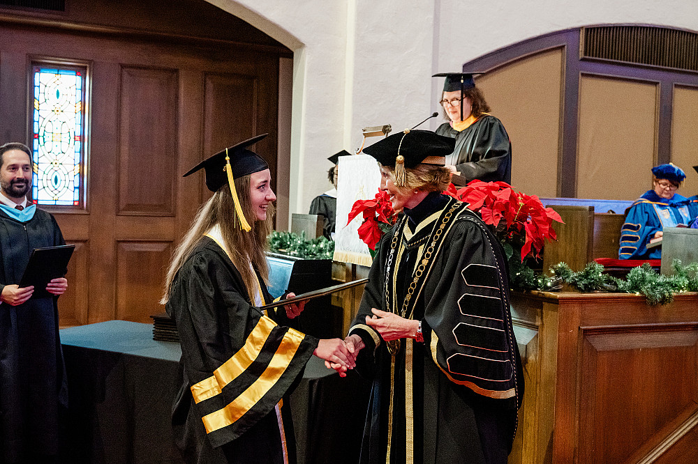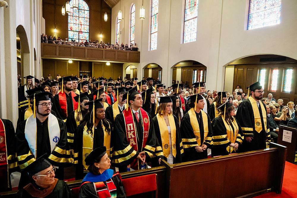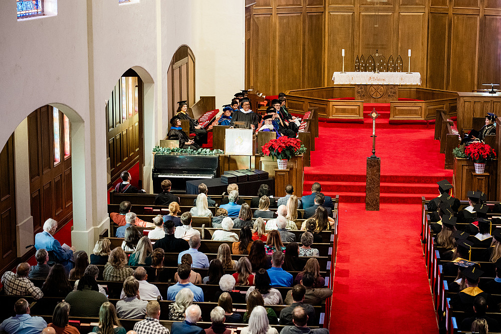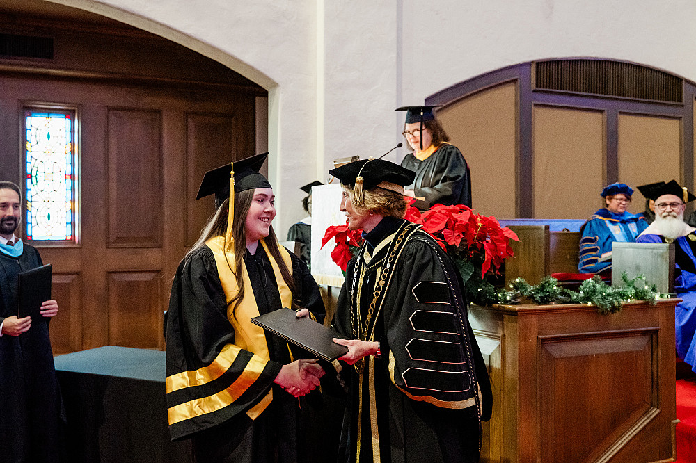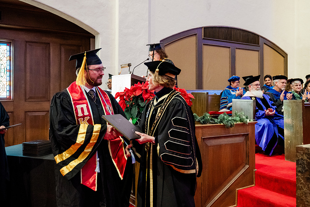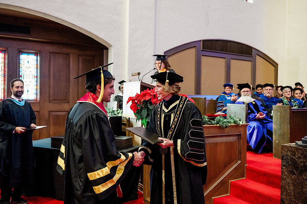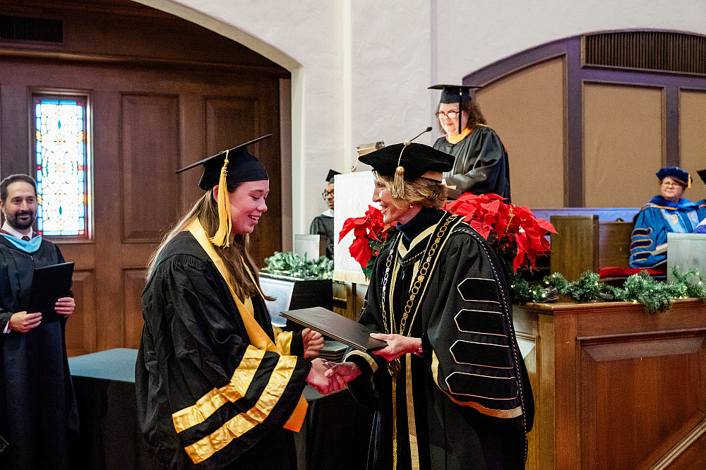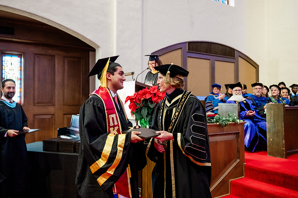 In front of a standing room-only crowd at the Lois Perkins Chapel, Southwestern University’s December graduates celebrated the completion of their undergraduate journeys with family, friends, faculty, and staff. Attendees heard remarks from Chaplain Ron Swain, President Laura Skandera Trombley, and alumni speaker Ben Woods ’06, prior to walking the stage and receiving their anticipated degrees.