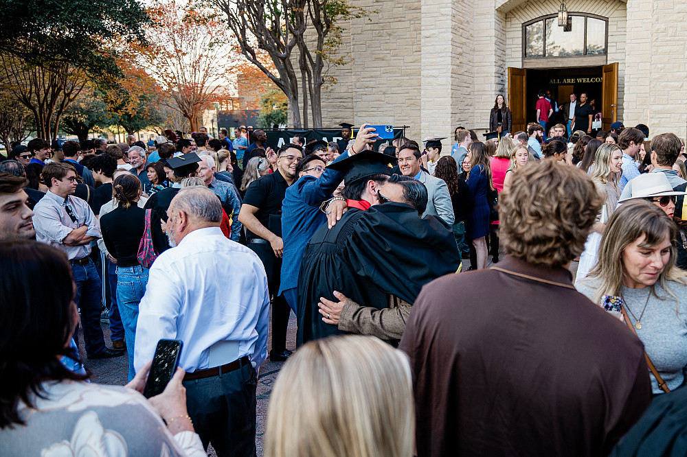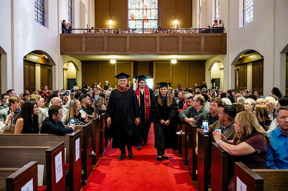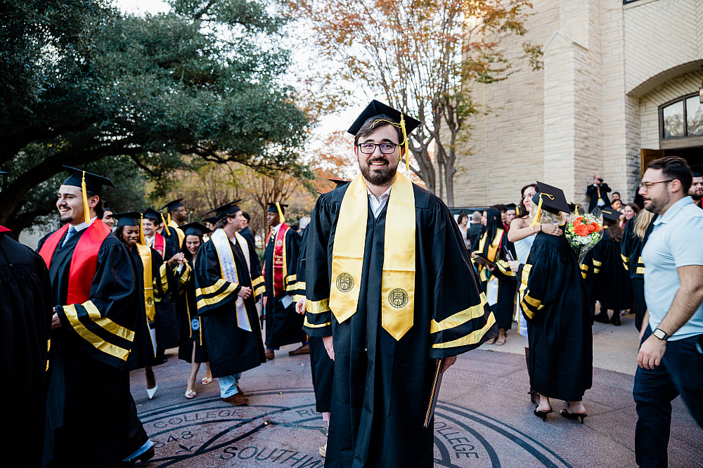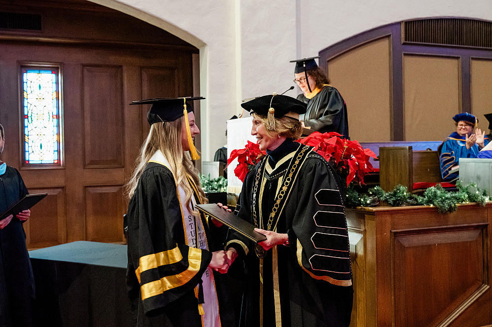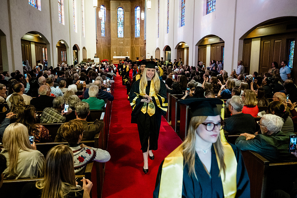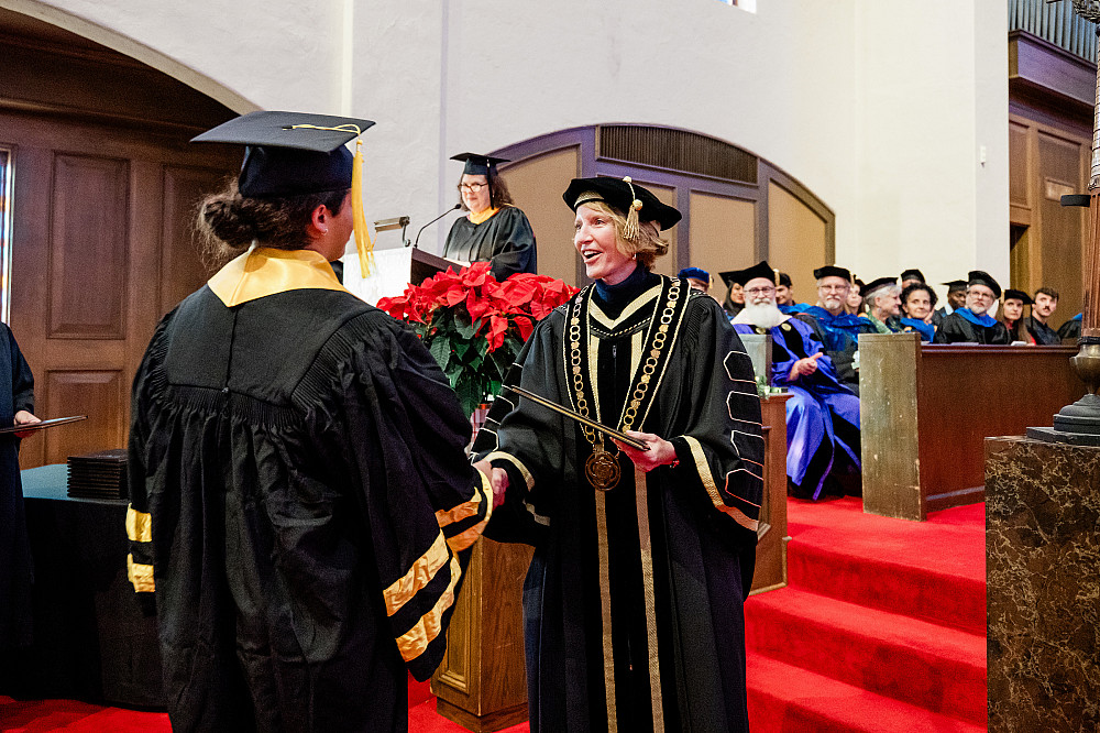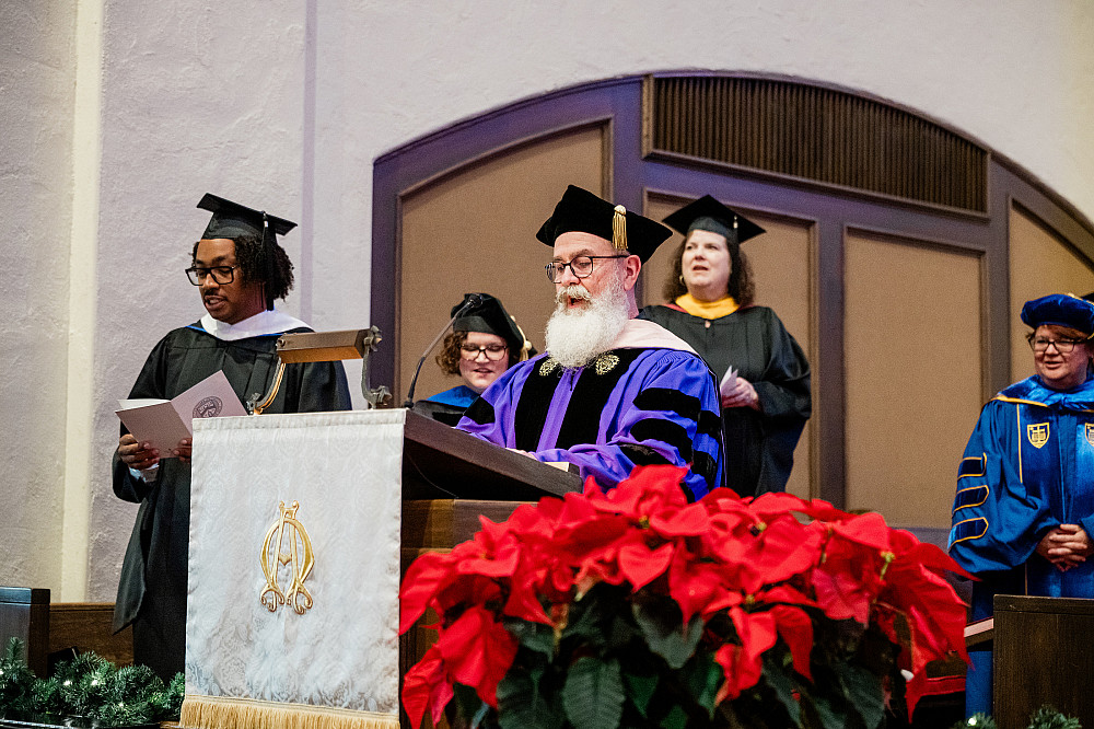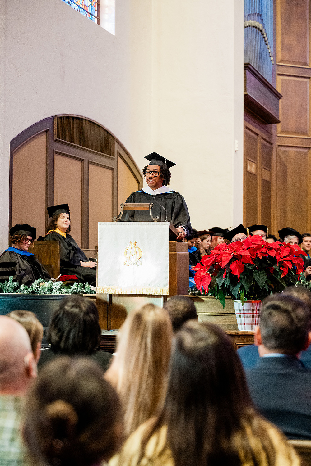 In front of a standing room-only crowd at the Lois Perkins Chapel, Southwestern University’s December graduates celebrated the completion of their undergraduate journeys with family, friends, faculty, and staff. Attendees heard remarks from Chaplain Ron Swain, President Laura Skandera Trombley, and alumni speaker Ben Woods ’06, prior to walking the stage and receiving their anticipated degrees.