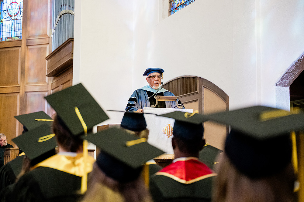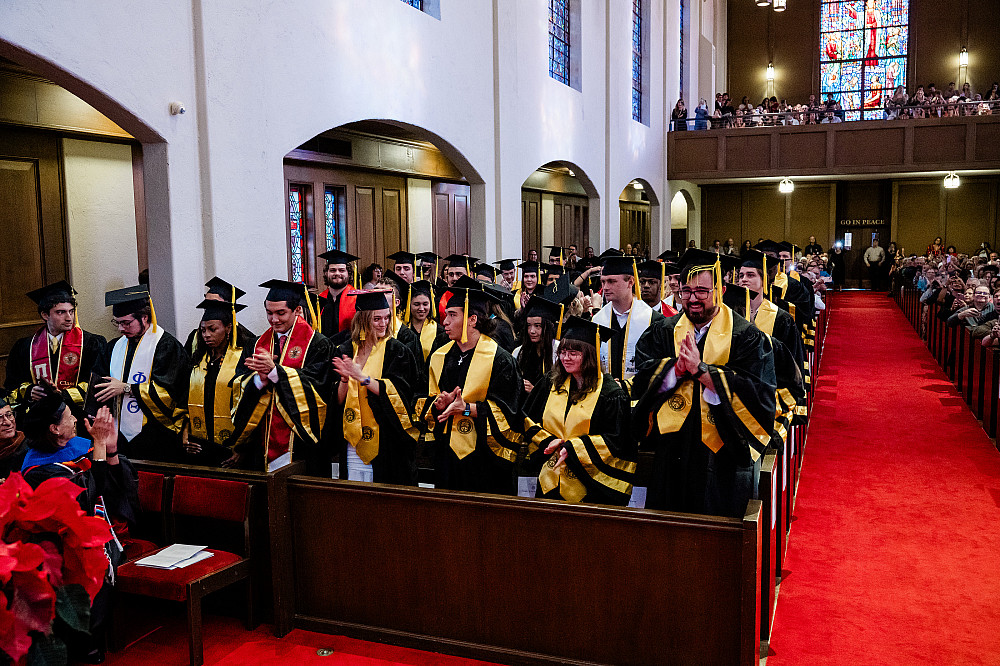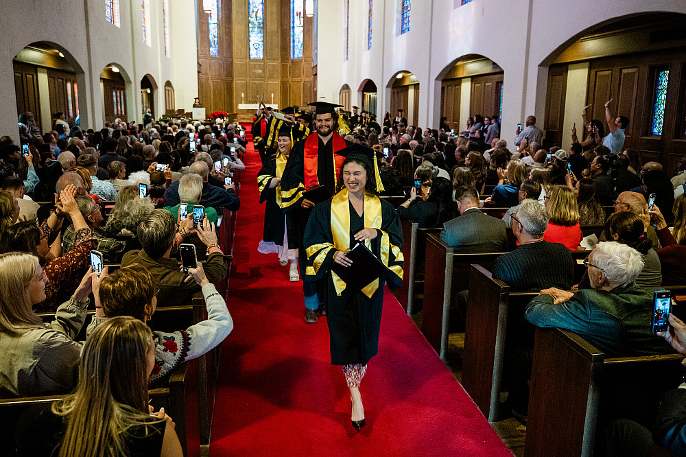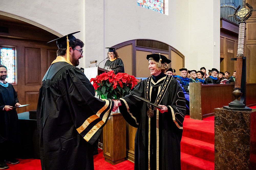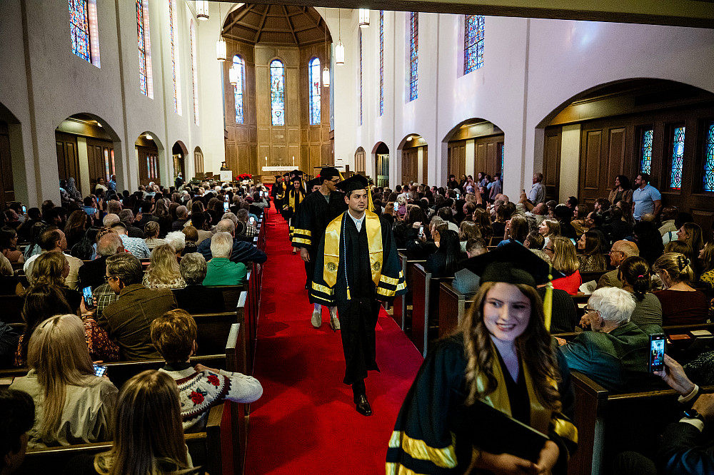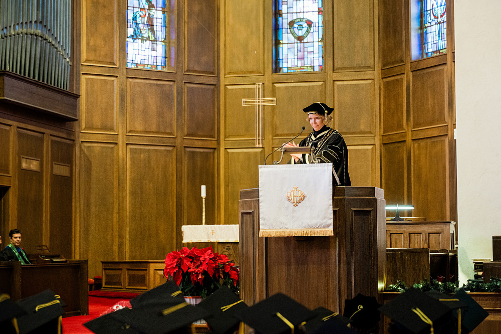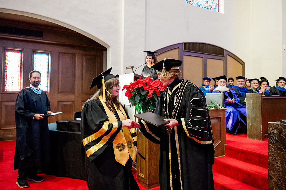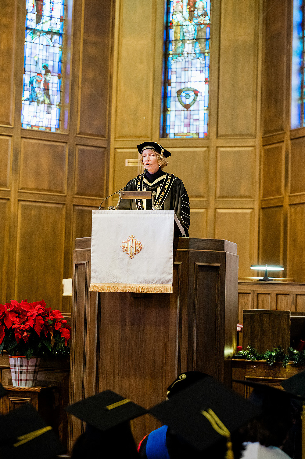 In front of a standing room-only crowd at the Lois Perkins Chapel, Southwestern University’s December graduates celebrated the completion of their undergraduate journeys with family, friends, faculty, and staff. Attendees heard remarks from Chaplain Ron Swain, President Laura Skandera Trombley, and alumni speaker Ben Woods ’06, prior to walking the stage and receiving their anticipated degrees.