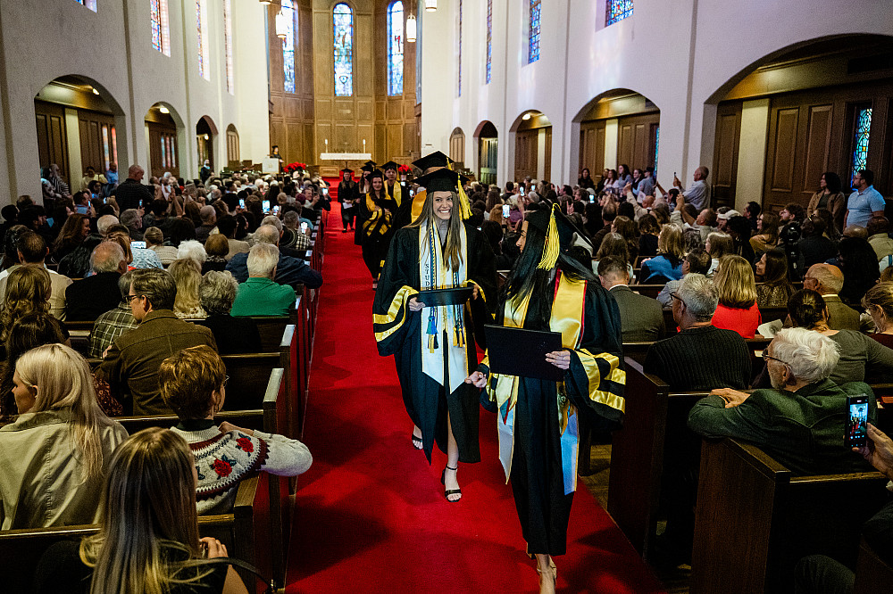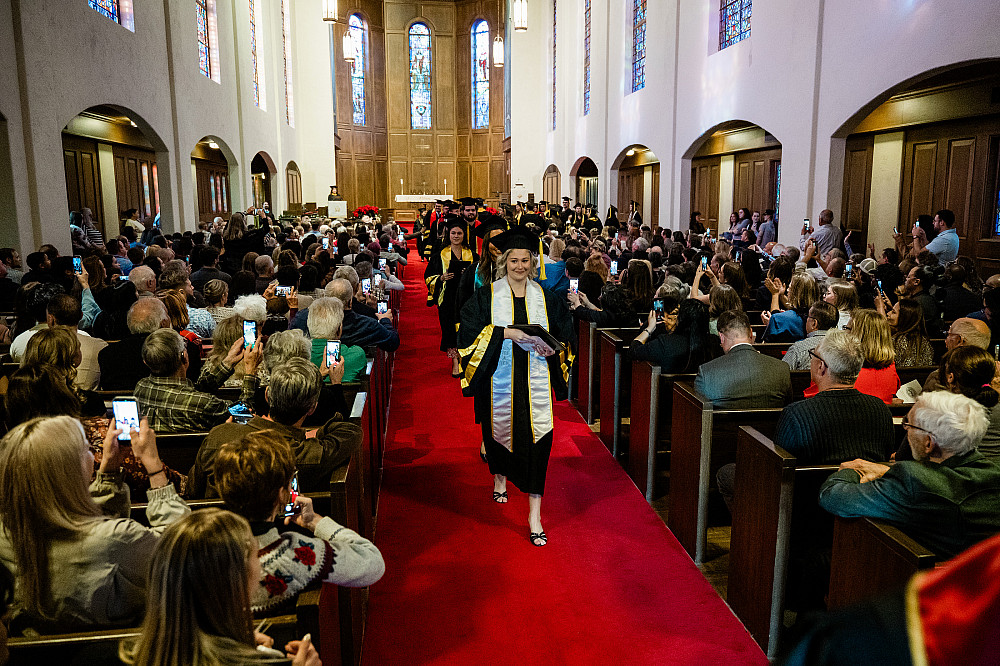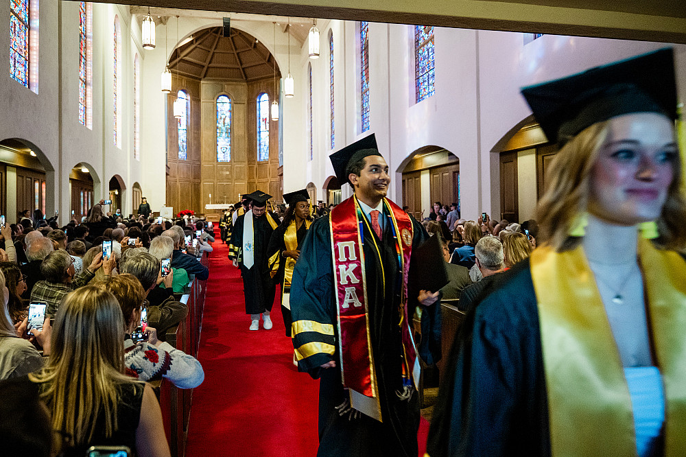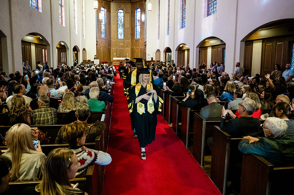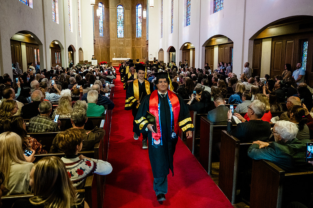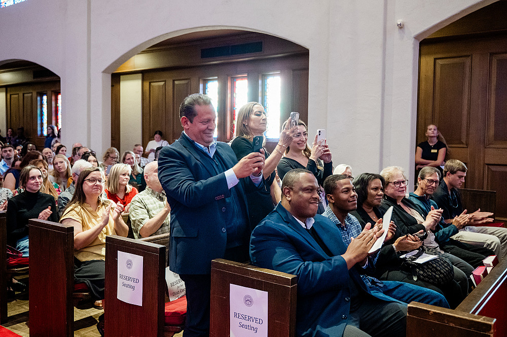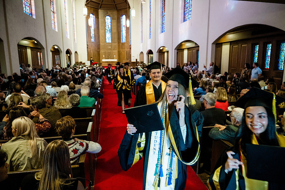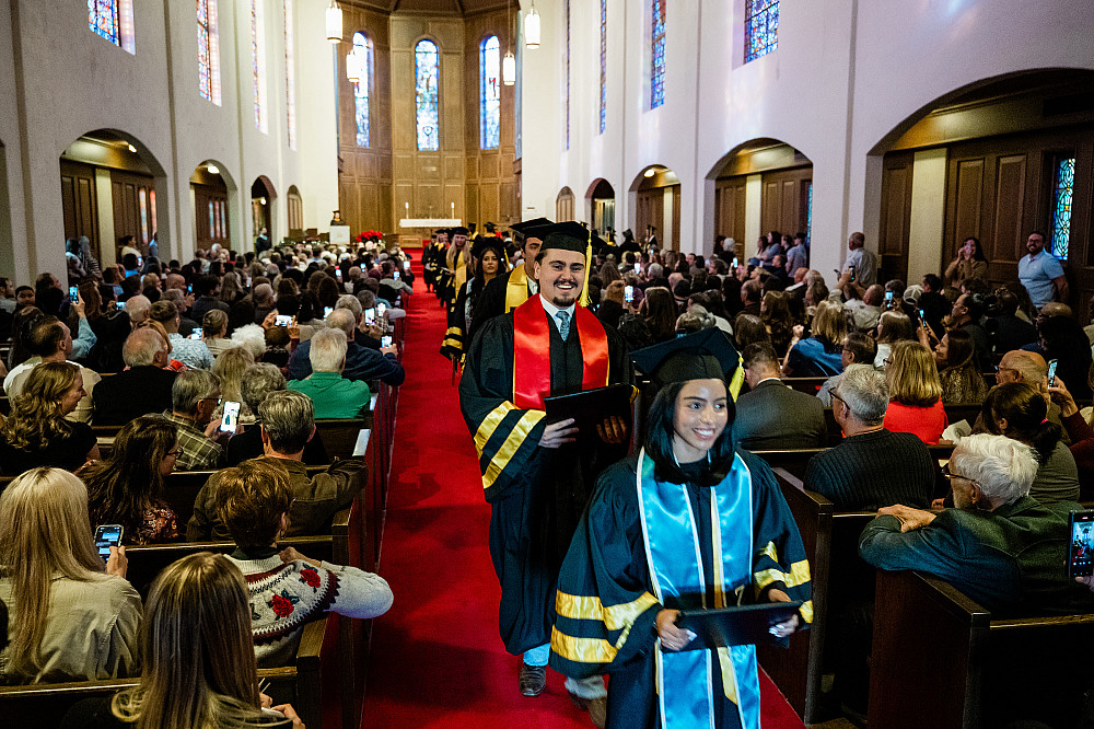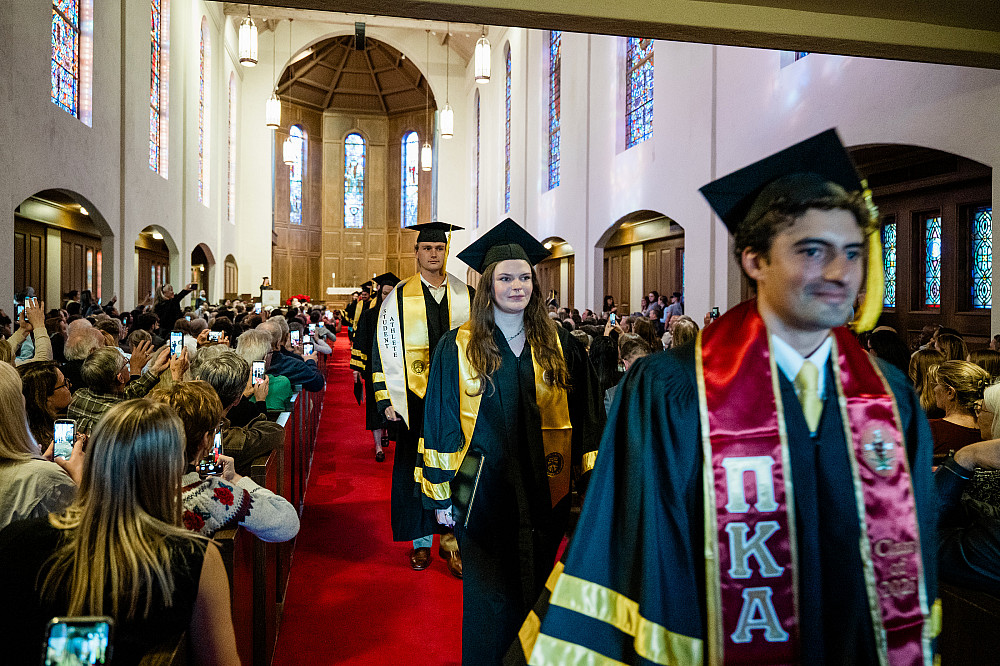 In front of a standing room-only crowd at the Lois Perkins Chapel, Southwestern University’s December graduates celebrated the completion of their undergraduate journeys with family, friends, faculty, and staff. Attendees heard remarks from Chaplain Ron Swain, President Laura Skandera Trombley, and alumni speaker Ben Woods ’06, prior to walking the stage and receiving their anticipated degrees.