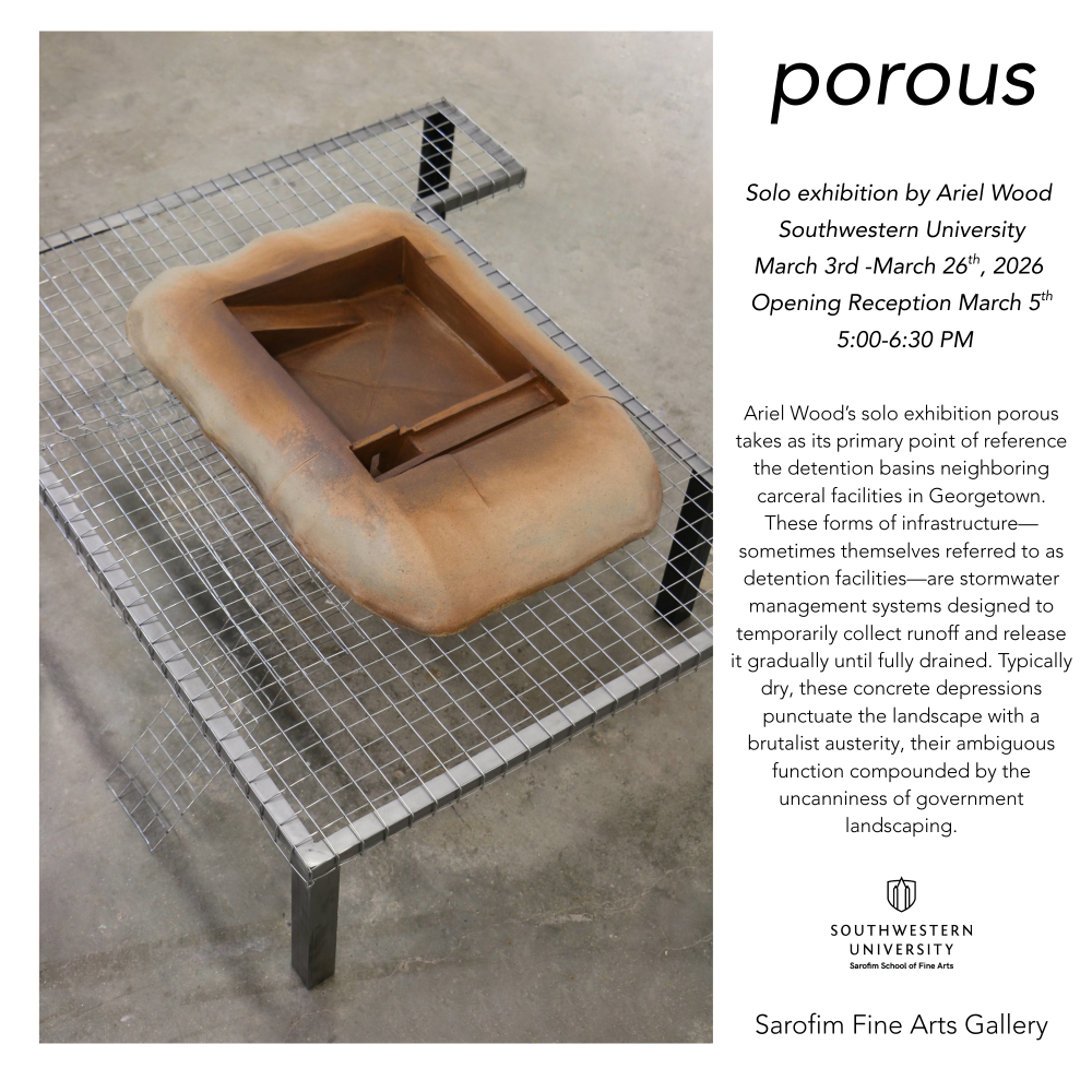 This exhibition will be on display March 3-26, 3026. The Sarofim School of Fine Arts Gallery is open Tuesday-Friday from 12:00-5:00pm during exhibitions. Admission is always free.